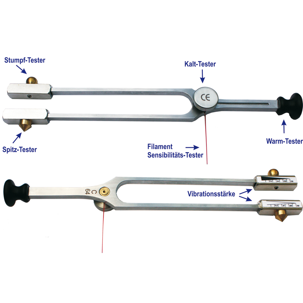 The neuropathy multifunctional tuning fork offers a wide range of possibilities in neurological examinations with the pointed-blunt test and the cold-warm test in combination with the properties of the typical Reidel-Seiffer tuning fork. The tuning fork also has a monofilament.